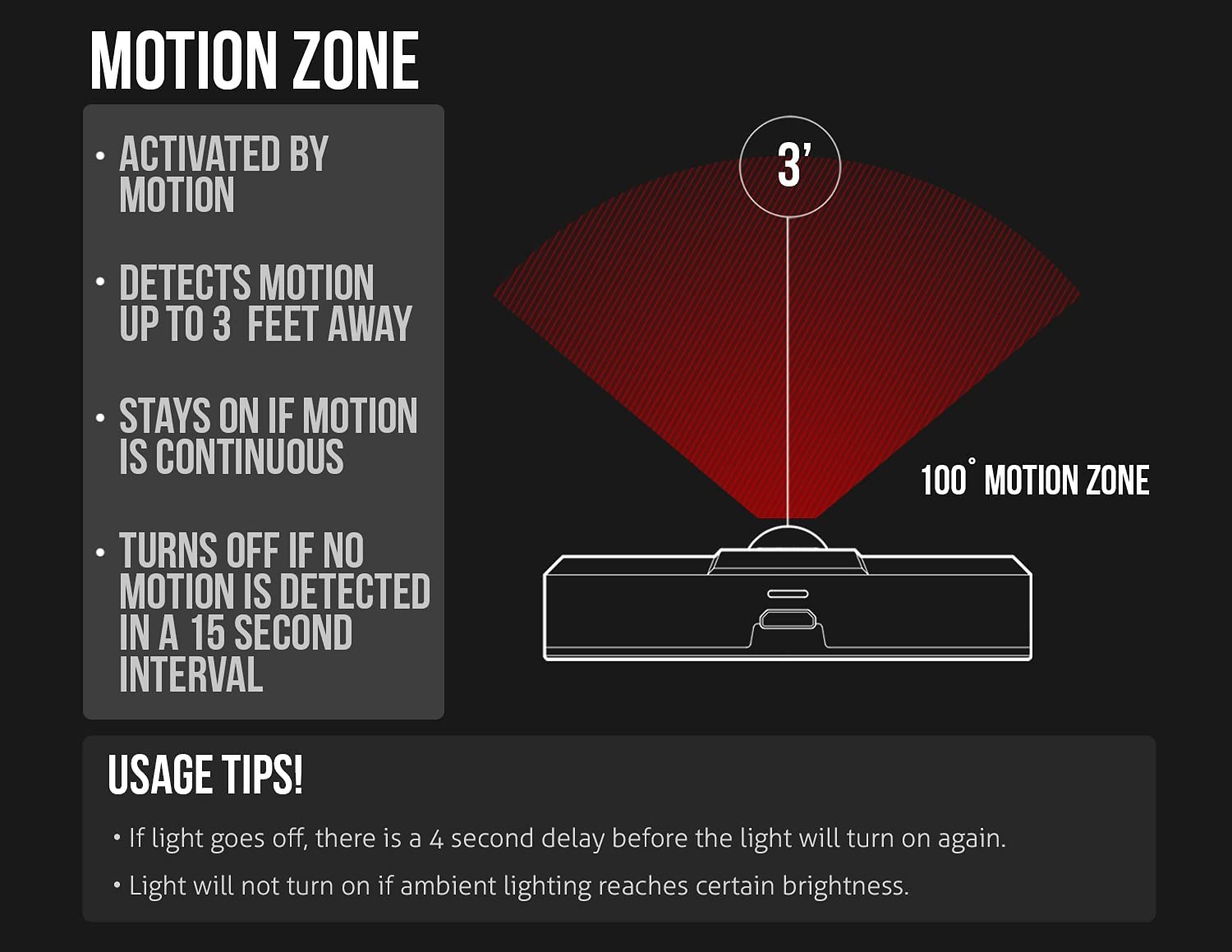 - Built in MOTION SENSOR has a detection range of 3 feet, and automatically illuminates when any motion is detected, such as a door opening or person walking near.