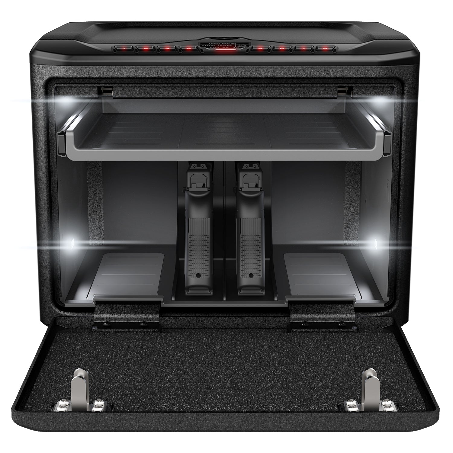 • Quick Access using the Smart Sense™ auto-illuminating 8-digit keypad with a built-in proximity sensor, along with the included (2) manual keys. Instantly retrieve your valuables, documents, and firearm(s) using the automatic opening door. Built-in LCD screen provides quick visual feedback and user friendly programming.