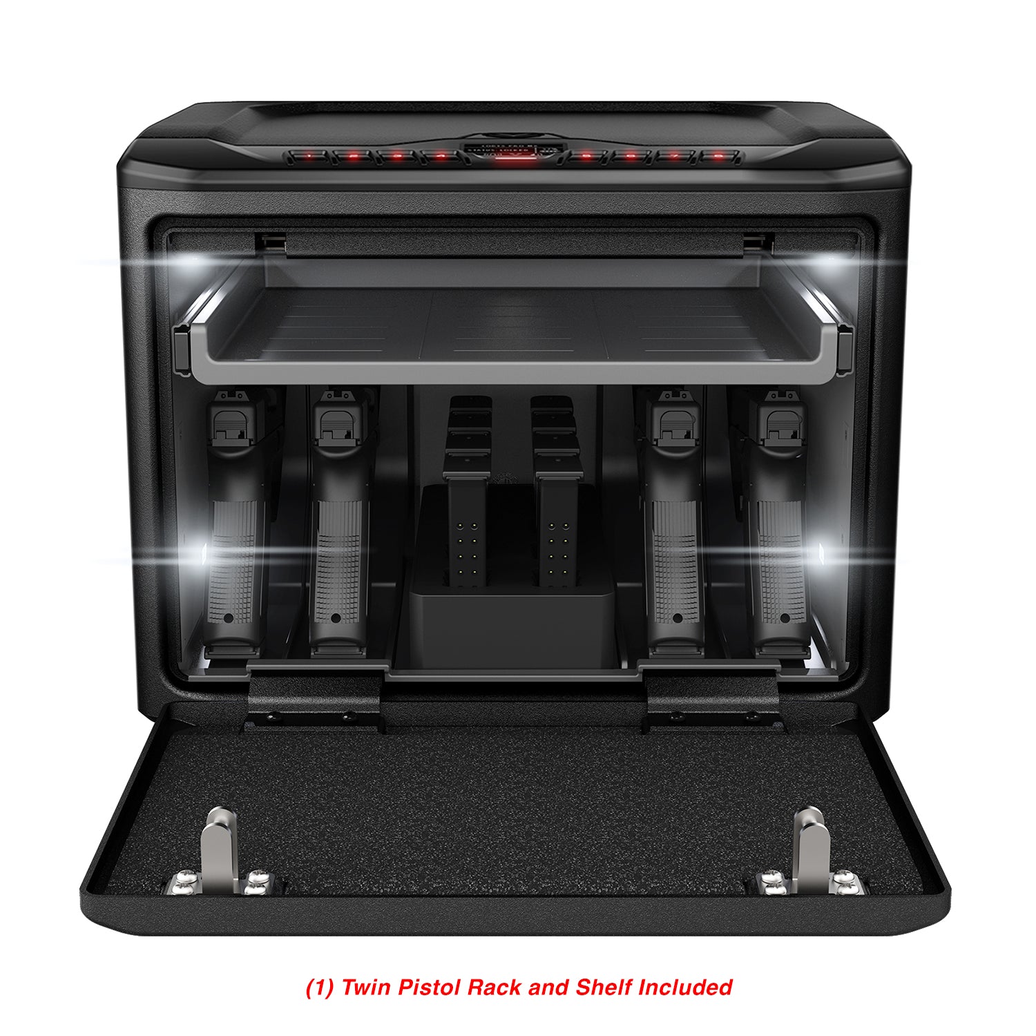 • Modular interior features a pull out height adjustable shelf and includes (1) high density foam Twin Pistol Rack. Customize your space and order additional accessories to store more handguns and magazines.