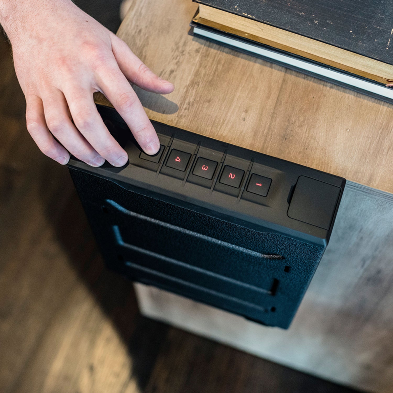 • Essential Series Slider provides quick access via the backlit 5-digit Smart Sense™ keypad. Powered by 4 AAA Batteries (not included) that last up to one year or more, or keep the safe plugged in continuously with the included power cable.
