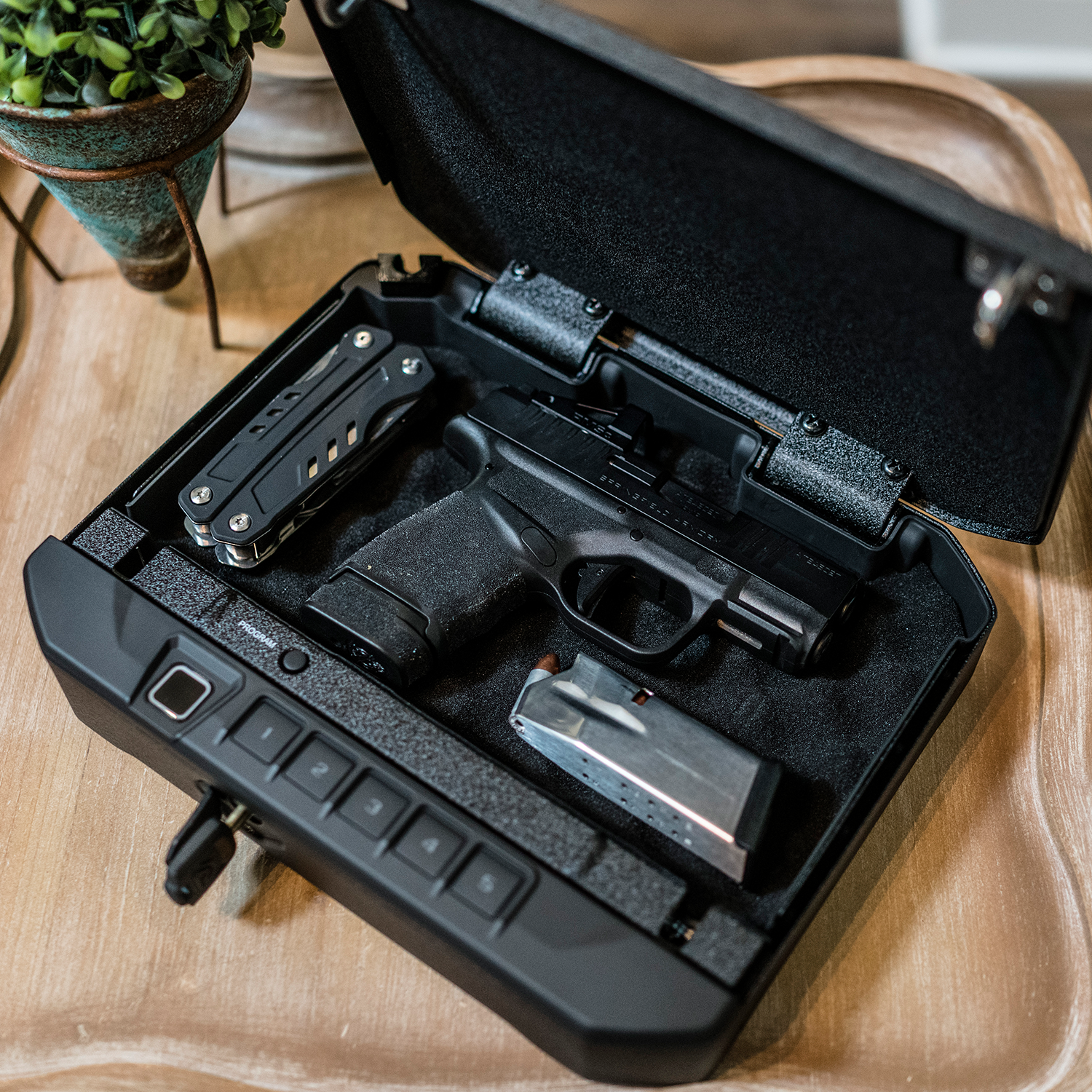 Quick authorized access to your valuables, documents, and firearm with the automatic opening lid using the biometric scanner, backlit numeric keypad, Nano Key 2.0 technology, or backup manual keys. Nano Key 2.0 not included.